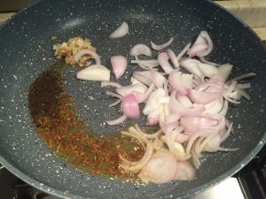 - Add the sliced onion along with slit green chili and stir on medium flame for 7-8 minutes until onions are almost soft.
